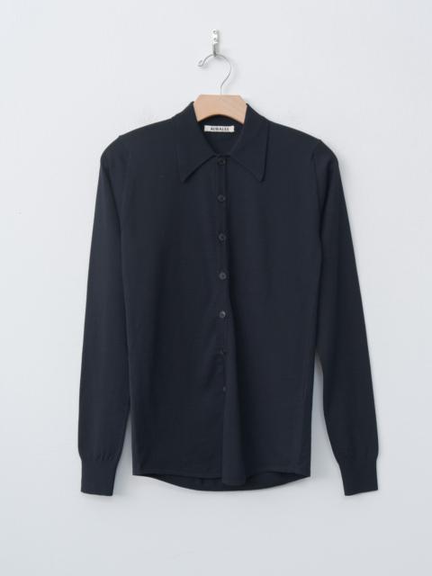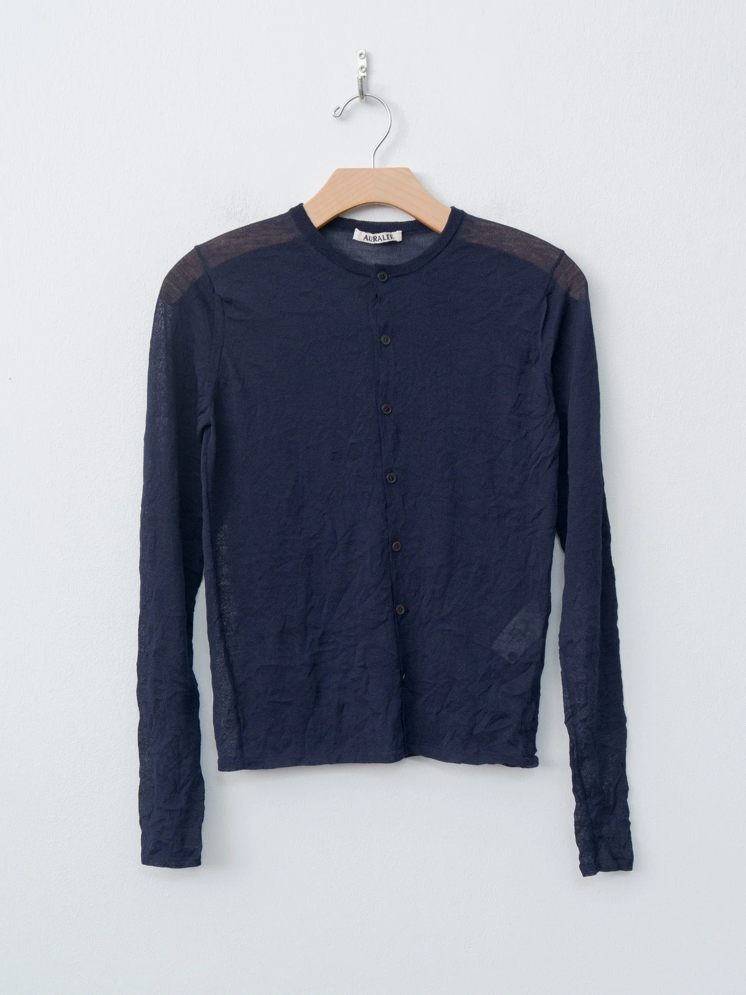 A lightweight crewneck cardigan from Auralee. The ultra-thin jersey knit is made by spinning fine wool and poly yarns using a special blending technique. Each piece is then carefully wrinkled by hand, resulting in a soft, lightweight fabric with a unique wrinkled appearance. It features a fully buttoned front, slightly cropped length and a close body fit that stretches to fit. - Made in Japan - 56% Wool, 44% Polyester - Available in Navy - The model is 5'7"/170cm and wears size 1/S