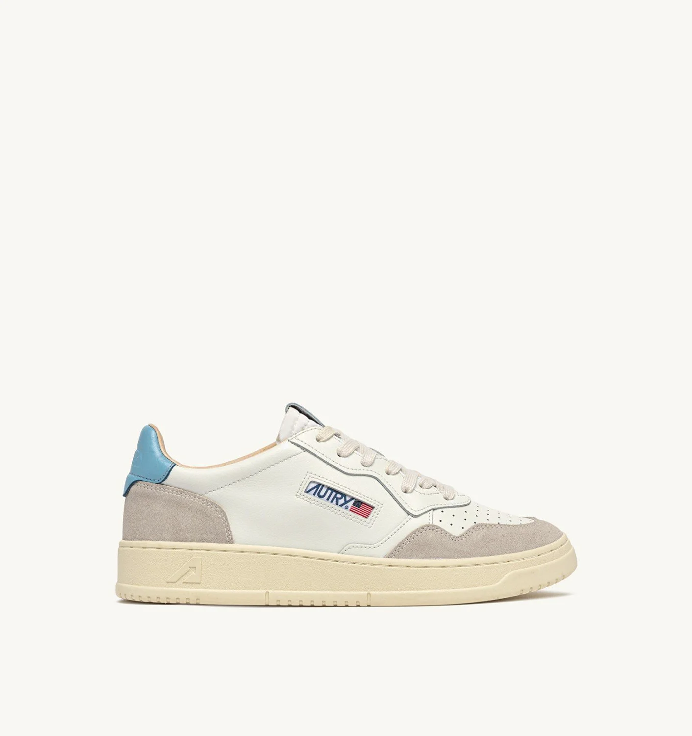Autry Medalist reimagines 1980s tennis style, blending heritage vibes with a clean, modern aesthetic. Characterized by an essential design, it is the perfect everyday sneaker thanks to its timeless and versatile mood, ensuring everyday comfort while combining classic style and functionality. The leather and suede variation adds a twist even to the most classic looks. This women's sneaker is made from soft white leather with an authentic look and finished with beige suede overlays and a light blue heel tab for a bold tactile and graphic mix. The leather heel detail, the tongue, and the jacquard side patch are all personalized with the Autry logo for an added touch of authenticity. SPECIFICATIONS: - Upper in suede and leather. - Micro-perforated toe. - Flat cotton laces. - Embroidery label detailing seamed at the tongue. - Padded ankle collar. - Leather and cotton terry lining. - 2 cm-high raised sockliner in leather. - Sole in rubber. - Height of sole: 2.5-3.5 cm. - Personalized shoe bag in fabric. COMPOSITION: Upper: 80% leather, 20% suede Lining: 40% leather, 50% cotton terry, 10% nylon Sole: 100% rubber