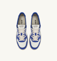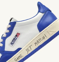 Elevate your everyday style with Autry's Medalist. This women's athletic shoe is crafted from white leather and finished with blue inserts creating a bold and striking graphic contrast. The rubber sole instantly evokes the spirit of tennis, featuring a personalized "Game Set Match!" lettering in a bold graffiti style. Autry's typical side logo insert adds the finishing touch to the design. SPECIFICATIONS: - Upper in leather. - Micro-perforated toe. - Flat cotton laces. - Embroidery label detailing seamed at the tongue. - Padded collar. - Leather, terry and nylon lining. - 2-cm raised sockliner in leather. - Rubber sole. - Height of sole: 2.5-3.5 cm. - Personalize shoe bag in fabric. COMPOSITION: Upper: 100% leather Lining: 40% leather, 50% cotton terry, 10% nylon Sole: 100% rubber