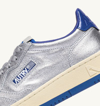 This Medalist sneakers is the quintessential everyday essential with Autry's typical attitude. The design combines 1980s tennis inspiration with premium materials and dynamic shapes, offering versatility for various looks while ensuring excellent comfort. This women’s sneakers is crafted from metalized silver leather, finished with micro-perforations at the toe for excellent breathability. Details on the outer side and heel are made of patent blue leather and personalized with the Autry logo, adding a touch of genuine originality. SPECIFICATIONS: - Upper in leather. - Micro-perforated toe. - Flat laces in cotton. - Embroidery label detailing seamed at the tongue. - Padded collar. - Leather and cotton terry lining. - 2 cm-high raised sockliner in leather. - Rubber sole. - Height of sole: 2.5-3.5 cm. - Personalized shoe bag in fabric. COMPOSITIONS: Upper: 85% metalized leather, 10% nylon, 5% leather Lining: 40% leather, 50% cotton terry, 10% nylon Sole: 100% rubber