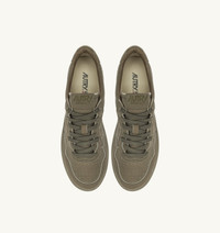 The typical imagery of tennis lies at the core of Autry's collections. Reimagined for a modern aesthetic, these Medalist sneakers make a statement with their matte monochromatic design, exuding an avant-garde and urban vibe. Crafted from soft green goatskin, this women's athletic shoe is finished with a matte treatment that extends across the entire upper and rubber sole. The toe features micro-perforations for enhanced breathability, while the side detail showcases the signature Autry logo. The worn-in appearance of the upper comes from a stone-washed treatment, handcrafted in Italy. This meticulous process, applied to each individual shoe, results in a unique look with intentional creases and varied color tones. SPECIFICATIONS: - Upper in washed goatskin. - Micro-perforated toe. - Flat cotton laces. - Embroidery label detailing seamed at the tongue. - Padded collar. - Leather, terry and nylon lining. - 2-cm raised sockliner in leather. - Rubber sole. - Height of sole: 2.5-3.5 cm. - Personalize shoe bag in fabric. COMPOSITION: Upper: 100% goatskin Lining: 40% leather, 50% cotton terry, 10% nylon Sole: 100% rubber