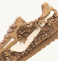Windspin sneakers bloom with floral charm in a version that blends elegance and femininity. Its sleek silhouette and flat, dynamic profile embody Autry’s signature mix of vintage appeal and modern style. The ultra-flat rubber sole ensures excellent grip on all urban surfaces. This unique version is crafted from leather with floral details accented by metallic studs that add shine and depth. Each flower is carefully applied by hand and finished with meticulous attention to detail, creating a lively yet refined design. Available in four exclusive pastel colorways, it’s a delicate choice perfect even for special occasions. SPECIFICATIONS: - Upper in leather. - Flat cotton laces. - Lightly padded tongue in nylon with jacquard logo label. - Padded ankle collar. - Leather and cotton terry lining. - 0.8 mm high mesh-lined sockliner. - Rubber sole. - Height of sole: 1-1.7 cm. - Personalized shoe bag in fabric. COMPOSITION: Upper: 100% leather Lining: 30% leather, 65% cotton terry, 5% nylon Sole: 100% rubber