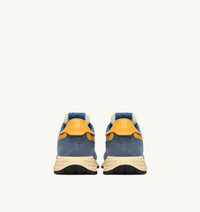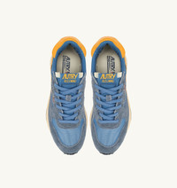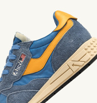 Innovative, light and extremely flexible, Reelwind Autry sneakers draw inspiration from the running world. The women's style is crafted from a mix of bluette suede and nylon, with side panels in yellow leather. Designed for a dynamic lifestyle, it features a slender silhouette and performance construction that ensures maximum freedom of movement. The rubber sole with an embossed tread is personalized with a star pattern and an A-arrow that offers a graphic and modern reinterpretation of the logo. SPECIFICATIONS: - Upper in nylon, suede, and mesh. - Mesh toe. - Flat cotton laces. - Label detailing at tongue. - Padded collar. - Nylon, leather and cotton terry lining. - 2-cm raised sockliner in leather. - Running outsole. - Height of sole: 2.5-3.5 cm. - Personalize shoe bag in fabric. COMPOSITION: Upper: 50% nylon, 40% leather, 10% mesh Lining: 40% leather, 50% cotton terry, 10% nylon Sole: 60% Phylon, 40% rubber