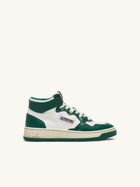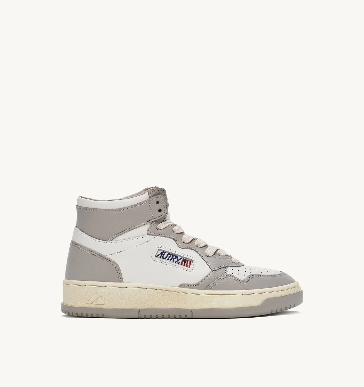 Bold colorways and signature details lend this Medalist high-top sneakers a fresh spin. An essential, ultimately cool accessory for everyday wear, this women's sneakers is crafted from soft leather in a white and gray colour block motif. The padded collar and natural rubber sole set the style apart, and offer unbeatable comfort. Finished with a gray tread and the Autry logo on the side. SPECIFICATIONS: - Bicolor leather upper - Perforated toe - Flat cotton laces - Label sewn on tongue - Padded ankle collar - Lined in leather and cotton terry - 2 cm leather insole - Rubber sole with contrasting tread - Height of sole: 2,5-3,5 cm. - Fabric dust bag. COMPOSITION: Upper Material: 100% cow leather Lining: 40% pigskin; 50% towel; 10% nylon Outsole: 100% rubber