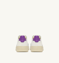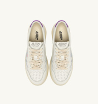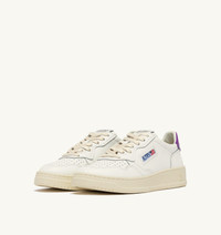 Autry Medalist reimagines 1980s tennis style, blending heritage vibes with a clean, modern aesthetic. Characterized by an essential design, it is the perfect everyday sneaker thanks to its timeless and versatile mood, ensuring everyday comfort while combining classic style and functionality. The leather version is the most classic variation, a true evergreen for every occasion. These women’s sneakers are crafted from soft, natural-looking white leather, finished with micro-perforations on the toe for excellent breathability. The purple leather heel tab, the jacquard side detail, and the stitched label on the tongue are customized with the Autry logo. SPECIFICATIONS: - Upper in leather. - Micro-perforated toe. - Flat cotton laces. - Embroidery label detailing seamed at the tongue. - Padded ankle collar. - Leather and cotton terry lining. - 2 cm-high raised sockliner in leather. - Sole in rubber. - Height of sole: 2.5-3.5 cm. - Personalized shoe bag in fabric. COMPOSITION: Upper: 100% leather Lining: 40% leather, 50% cotton terry, 10% nylon Sole: 100% rubber