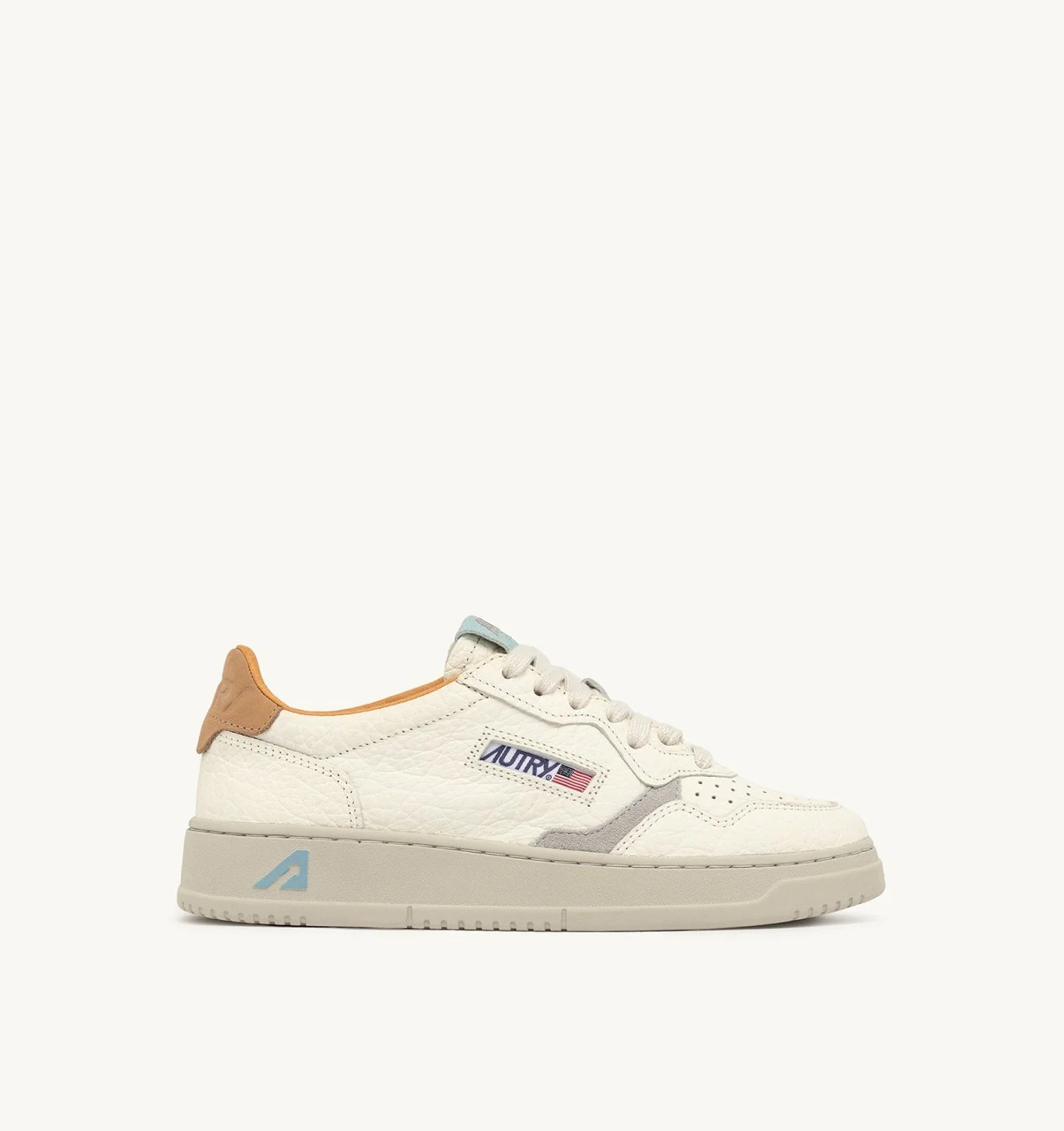 This Medalist sneakers is the quintessential everyday essential with Autry's typical attitude. The design blends inspiration from 1980s tennis style with quality materials and dynamic shapes, adapting to various looks while ensuring excellent comfort. These women's athletic shoes are crafted from white pebbled leather for a unique look and feel, finished with small suede details at the sides and micro-perforations on the toe for excellent breathability. The nubuck leather logo detail on the heel, the side Autry logo insert and the color matching sole personalize the look. SPECIFICATIONS: - Solid color leather upper. - Micro-perforated toe. - Flat cotton laces. - Embroidery label detailing seamed at the tongue. - Padded collar. - Leather and cotton terry lining. - 2-cm raised sockliner in leather. - Rubber sole. - Height of sole: 2.5-3.5 cm. - Personalize shoe bag in fabric. COMPOSITION: Upper: 85% leather; 10% suede; 5% nubuck Lining: 40% leather, 50% cotton terry, 10% nylon Sole: 100% rubber