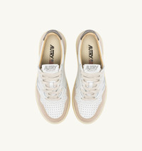 Reimagined with modern proportions and high-quality materials, Medalist Autry sneakers draw inspiration from 1980s tennis style while keeping up with modern trends This women's athletic shoe is crafted from soft, authentic-looking white leather and finished with beige suede reinforcements for a bold tactile and graphic mix. The green leather detail adorning the heel is personalized with the Autry logo. SPECIFICATIONS: - Upper in suede and leather. - Micro-perforated toe. - Flat cotton laces. - Embroidery label detailing seamed at the tongue. - Padded collar. - Leather and cotton terry lining. - 2-cm raised sockliner in leather. - Rubber sole. - Height of sole: 2.5-3.5 cm. - Personalize shoe bag in fabric. COMPOSITION: Upper: 70% leather; 20% suede; 10% nylon Lining: 40% leather; 50% cotton terry; 10% nylon Sole: 100% rubber