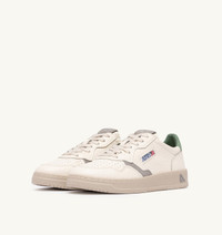 Autry Medalist reimagines 1980s tennis style, blending heritage vibes with a clean, modern aesthetic. Characterized by an essential design, it is the perfect everyday sneaker thanks to its timeless and versatile mood, ensuring everyday comfort while combining classic style and functionality. This version pairs an unexpected mix of textures with an iconic shape This women’s sneaker is made from naturally grained leather with a unique look and exceptional softness, featuring small suede side details and micro-perforations at the toe for excellent breathability. The green nubuck leather heel tab with logo, the jacquard Autry side patch, and the slightly darker outsole add signature character. SPECIFICATIONS: - Leather and nubuck leather upper. - Micro-perforated toe. - Flat cotton laces. - Embroidery label detailing seamed at the tongue. - Padded ankle collar. - Leather and cotton terry lining. - 2 cm-high raised sockliner in leather. - Sole in rubber. - Height of sole: 2.5-3.5 cm. - Personalized shoe bag in fabric. COMPOSITION: Upper: 85% leather, 5% metalized leather, 10% suede Lining: 40% leather, 50% cotton terry, 10% nylon Sole: 100% rubber