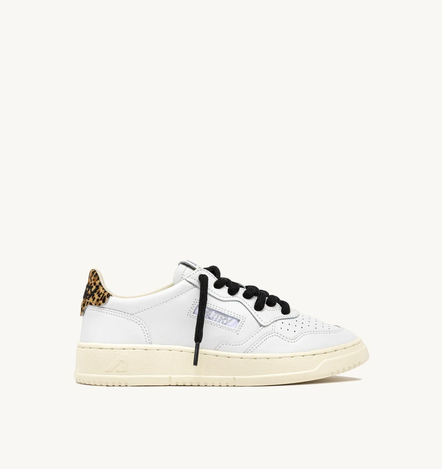 Autry Medalist reimagines 1980s tennis style, blending heritage vibes with a clean, modern aesthetic. Defined by its essential design, it’s the perfect everyday sneaker with timeless, versatile feel, delivering all-day comfort with a mix of classic style and functionality. This women's sneaker is crafted from soft white leather with an authentic look and finished with standout details like black laces and a side logo with a silver-tone lurex effect. The pony skin-effect animalier-print heel detail is embroidered with the Autry logo. SPECIFICATIONS: - Upper in leather. - Micro-perforated toe. - Round laces in Lurex. - Embroidery label detailing seamed at the tongue. - Padded ankle collar. - Leather and cotton terry lining. - 2 cm-high raised sockliner in leather. - Rubber sole. - Height of sole: 2.5-3.5 cm. - Personalized shoe bag in fabric. COMPOSITION: Upper: 100% leather Lining: 40% leather, 50% cotton terry, 10% nylon Sole: 100% rubber
