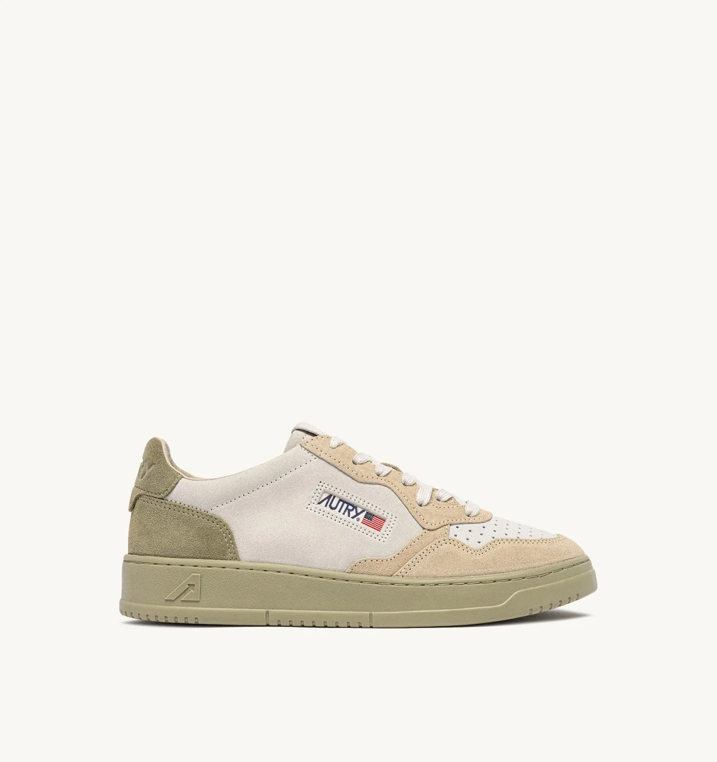 Autry Medalist reimagines 1980s tennis style, blending heritage vibes with a clean, modern aesthetic. Characterized by an essential design, it is the perfect everyday sneaker thanks to its timeless and versatile mood, ensuring everyday comfort while combining classic style and functionality. This version delivers the perfect mix of color-block suede shades. This women's sneaker is crafted from soft, premium suede in a tricolor color-block palette of white, green, and beige, giving it an authentic look and a strong personality. The micro-perforated toe ensures excellent breathability. Details on the tongue, outer side, and heel are customized with the Autry logo, adding an authentic touch for a modern everyday aesthetic. SPECIFICATIONS: - Suede upper. - Micro-perforated toe. - Flat cotton laces. - Embroidery label detailing seamed at the tongue. - Padded ankle collar. - Leather and cotton terry lining. - 2 cm-high raised sockliner in leather. - Sole in rubber. - Height of sole: 2.5-3.5 cm. - Personalized shoe bag in fabric. COMPOSITION: Upper: 100% suede Lining: 40% leather, 50% cotton terry, 10% nylon Sole: 100% rubber