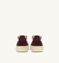 Reworked with modern proportions and premium materials, the Autry Medalist sneakers brings '80s tennis inspiration into the now. This women’s sneakers introduces a new take on the Medalist, crafted from white leather with unique burgundy glitter-effect inserts, offering a bold mix of textures and visual flair. This style has an authentic feel, staying true to Autry’s signature details while delivering a bright, glamorous look. The leather heel tab, tongue, and side insert are all customized with the Autry logo. SPECIFICATIONS: - Upper in leather. - Micro-perforated toe. - Flat laces. - Embroidery label detailing seamed at the tongue. - Padded collar. - Leather and cotton terry lining. - 2 cm-high raised sockliner in leather. - Rubber sole. - Height of sole: 2.5-3.5 cm. - Personalized shoe bag in fabric. SPECIFICATIONS: Upper: 100% leather Lining: 40% leather; 50% cotton terry; 10% nylon Sole: 100% rubber