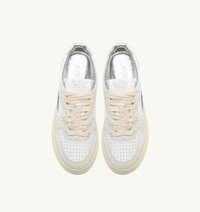Reworked with modern proportions and premium materials, the Autry Medalist sneakers brings '80s tennis inspiration into the now. This women’s sneakers introduces a new take on the Medalist, crafted from white leather with unique glitter-effect inserts, offering a bold mix of textures and visual flair. This style has an authentic feel, staying true to Autry’s signature details while delivering a bright, glamorous look. The leather heel tab, tongue, and side insert are all customized with the Autry logo. SPECIFICATIONS: - Upper in leather. - Micro-perforated toe. - Flat laces. - Embroidery label detailing seamed at the tongue. - Padded collar. - Leather and cotton terry lining. - 2 cm-high raised sockliner in leather. - Rubber sole. - Height of sole: 2.5-3.5 cm. - Personalized shoe bag in fabric. SPECIFICATIONS: Upper: 100% leather Lining: 40% leather; 50% cotton terry; 10% nylon Sole: 100% rubber