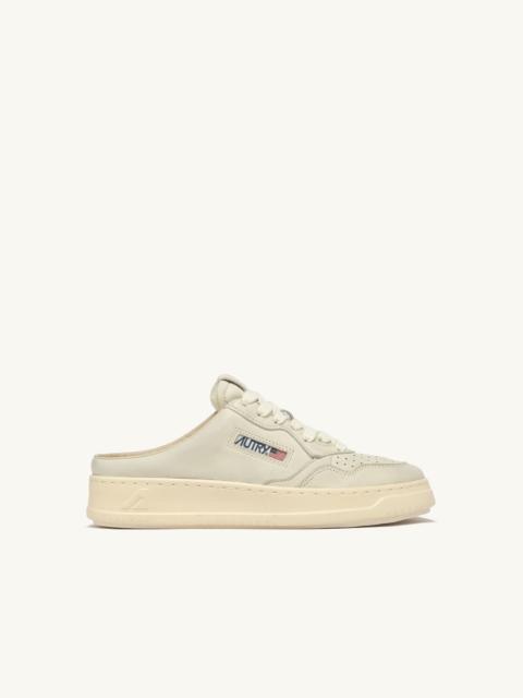 The Medalist's signature lines are reimagined in a relaxed, lightweight mule design. The women's style is crafted from white napa leather that maintains an authentic appearance, paired with a natural rubber sole. This streetwear update, featuring an exposed heel, offers an innovative style experience, while the wide upper, perforated toe, and terry lining ensure Autry's distinctive comfort. The light worn effect of the Autry napa leather mules is achieved through a stonewashing treatment, a process applied to each individual shoe, resulting in a look that may intentionally feature creases and uneven coloration. SPECIFICATIONS: - Super-soft napa leather upper. - Micro-perforated toe. - Flat cotton laces. - Embroidery label detailing seamed at the tongue. - Leather and cotton terry lining. - 2-cm raised sockliner in leather. - Rubber sole. - Height of sole: 2.5-3.5 cm. - Personalize shoe bag in fabric. COMPOSITION: Upper: 100% goatskin Lining: 40% leather, 50% cotton terry, 10% nylon Sole: 100% Phylon with TPU base