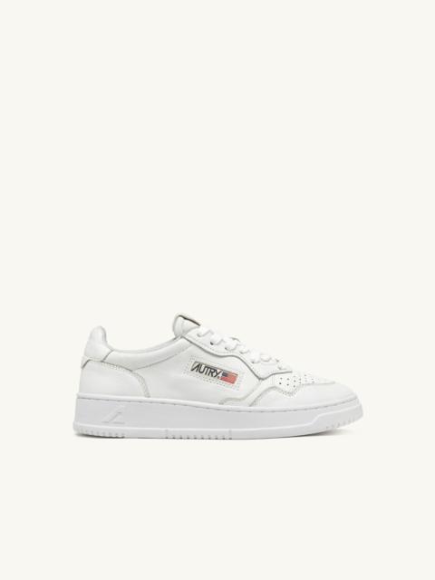 Autry Medalist reimagines 1980s tennis style, blending heritage vibes with a clean, modern aesthetic. Defined by its essential design, it’s the perfect everyday sneaker with timeless, versatile feel, delivering all-day comfort with a mix of classic style and functionality. In this version, oversized puffy laminated laces and gold logos add a shiny touch to the perfect white sneaker. This women’s sneaker is crafted from soft white leather with an authentic look and finished with original details like the laces and a side logo with a lurex effect. The beige suede heel detail is embroidered with the Autry logo. SPECIFICATIONS: - Upper in leather. - Micro-perforated toe. - Round laces in Lurex. - Embroidery label detailing seamed at the tongue. - Padded ankle collar. - Leather and cotton terry lining. - 2 cm-high raised sockliner in leather. - Rubber sole. - Height of sole: 2.5-3.5 cm. - Personalized shoe bag in fabric. COMPOSITION: Upper: 95% leather; 5% suede Lining: 10% leather, 30% mesh, 50% cotton terry, 10% nylon Sole: 100% rubber