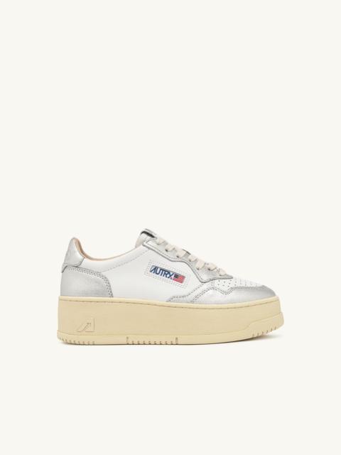A new interpretation of our ultimate icon: the Autry Medalist. Striking the perfect balance between '80s tennis inspiration and a contemporary attitude, this women's sneakers elevates the versatile and distinctive design of the Medalist with unexpected volumes and bright new colorways. All the signature elements remain unchanged: it's crafted from supple leather in a white and black colour-block pattern, perforated for breathability, and branded with the Autry logo on the side. The rubber platform sole gives the silhouette a literal lift while offering a comfortable, steady stride. SPECIFICATIONS: - Leather upper. - Perforated toe. - Flat cotton laces. - Label sewn on tongue. - Padded ankle collar. - Lined in leather and cotton terry. - 2 cm leather insole. - Rubber platform sole. - Height of sole: 4 cm. - Fabric dust bag. COMPOSITION: Upper Material: 100% cow leather Lining: 40% pigskin, 50% towel, 10% nylon Outsole: 100% rubber