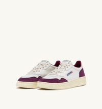 Autry Medalist heralds a new era of style and comfort. Featuring a low-top profile, this women's athletic shoe is crafted from white goatskin with purple suede inserts and features a white heel tab defining the upper. Features like the micro-perforated toe and the rubber sole ensure total breathability and support for the foot, all day long. The Autry logo at side adds the finishing touch. The worn-in appearance of the leather is achieved through a 'stone milling' treatment, handcrafted in Italy. This process, applied to each individual shoe, gives the suede a unique look with intentional creases and varied color tones. SPECIFICATIONS: - Upper in goatskin and suede with handcrafted washed treatment. - Micro-perforated toe. - Flat cotton laces. - Embroidery label detailing seamed at the tongue. - Padded collar. - Pigskin, cotton terry and nylon lining. - 2-cm raised sockliner in leather. - Rubber sole. - Height of sole: 2.5-3.5 cm. - Personalize shoe bag in fabric. COMPOSITIONS: Upper: 80% goatskin, 20% suede Lining: 40% leather, 50% cotton terry, 10% nylon Sole: 100% rubber