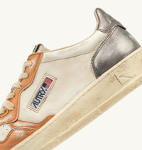Medalist Super Vintage sneakers are the most authentic expression of Autry. This tennis-inspired design is comfortable and cozy, thanks to the high-quality materials used, while the 1980s vibe is enhanced by artisanal treatments that create a used, irregular, and unique look for each pair. These women's athletic shoes are made from soft leather with a lived-in appearance in white, metalized orange and gray tones. The side insert draws attention to the distinctive Autry logo. The exclusive treatment used to create the vintage look is entirely Made in Italy. SPECIFICATIONS: - Leather upper with artisanal used treatment. - Micro-perforated toe. - Used-effect cotton laces. - Embroidery label detailing seamed at the tongue. - Padded collar. - Leather and cotton terry lining. - 2-cm raised sockliner in leather. - Rubber sole. - Height of sole: 2.5-3.5 cm. - Personalize shoe bag in fabric. COMPOSITION: Upper: 100% leather Lining: 40% leather; 50% cotton terry; 10% nylon Sole: 100% rubber