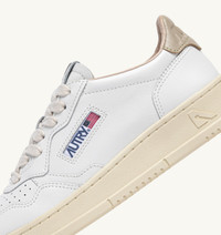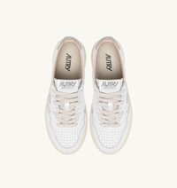 This Medalist sneakers is the quintessential everyday essential with Autry's typical attitude. The design blends 1980s tennis inspiration with premium materials and dynamic lines, making it a versatile choice that delivers great comfort. This women’s sneakers is crafted from soft, naturally textured white leather, finished with micro-perforations at the toe for enhanced breathability. Beige leather accents on the outer side and heel are customized with the Autry logo. SPECIFICATIONS: - Upper in leather. - Micro-perforated toe. - Flat laces in cotton. - Embroidery label detailing seamed at the tongue. - Padded collar. - Leather and cotton terry lining. - 2 cm-high raised sockliner in leather. - Rubber sole. - Height of sole: 2.5-3.5 cm. - Personalized shoe bag in fabric. SPECIFICATIONS: Upper: 100% leather Lining: 40% leather, 50% cotton terry, 10% nylon Sole: 100% rubber