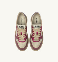 Medalist Super Vintage sneakers are the most authentic expression of Autry. This tennis-inspired design is comfortable and cozy, thanks to the high-quality materials used, while the 1980s vibe is enhanced by artisanal treatments that create a used, irregular, and unique look for each pair. These women's sneakers are made from soft, white leather with a lived-in appearance and inserts in fuchsia and purple laminated leather. The side insert draws attention to the jacquard logo. The exclusive treatment used to create the vintage look is entirely Made in Italy. SPECIFICATIONS: - Leather upper with a handcrafted used finish. - Micro-perforated toe. - Used-effect cotton laces. - Embroidery label detailing seamed at the tongue. - Padded collar. - Leather and cotton terry lining. - 2 cm-high raised sockliner in leather. - Rubber sole. - Height of sole: 2.5-3.5 cm. - Personalized shoe bag in fabric. SPECIFICATIONS: Upper: 100% leather Lining: 40% leather; 50% cotton terry; 10% nylon Sole: 100% rubber