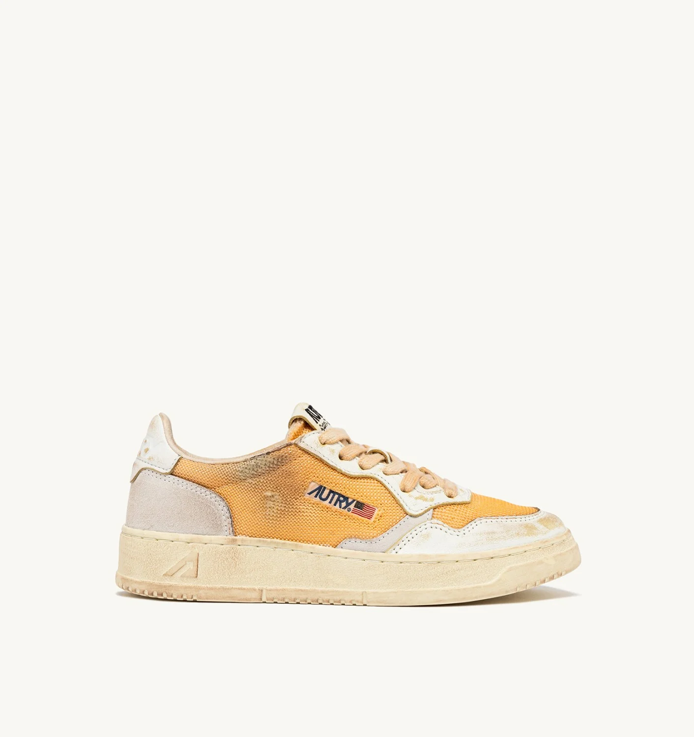 Medalist Super Vintage sneakers are the most authentic expression of Autry. This tennis-inspired design is comfortable and cozy, thanks to the high-quality materials used, while the 1980s vibe is enhanced by artisanal treatments that create a used, irregular, and unique look for each pair. These women's sneakers are crafted from orange mesh with a lived-in look and features goatskin and suede inserts in shades of white. The side insert draws attention to the distinctive Autry logo. The exclusive treatment used to create the vintage look is entirely Made in Italy. SPECIFICATIONS: - Upper in mesh, leather and suede. - Mesh toe. - Flat cotton laces. - Embroidery label detailing seamed at the tongue. - Padded collar. - Leather, terry and nylon lining. - 2-cm raised sockliner in leather. - Rubber sole. - Height of sole: 2.5-3.5 cm. - Personalize shoe bag in fabric. COMPOSITION: Upper: 55% mesh, 30% goatskin, 15% leather Lining: 40% leather, 50% cotton terry, 10% nylon Sole: 100% rubber