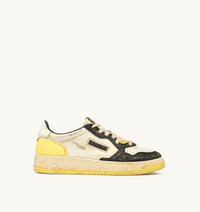 These women's Super Vintage sneakers blend typical 1980s design with meticulous, handcrafted detailing unique to each style. Featuring a paneled construction in soft leather with a lived-in finish, they come in shades of white, yellow, and black. The focus is on material customization, highlighted by crackle effects that give the leather a worn, vintage appeal. A solid-color rubber sole and distinctive logo details complete the look: characteristic side insert and distinctive A-arrow at side. SPECIFICATIONS: - Upper in leather and crackle-effect leather. - Micro-perforated toe. - Flat cotton laces. - Embroidery label detailing seamed at the tongue. - Padded collar. - Leather, terry and nylon lining. - 2-cm raised sockliner in leather. - Rubber sole. - Height of sole: 2.5-3.5 cm. - Personalize shoe bag in fabric. COMPOSITION: Upper: 85% leather, 10% nylon, 5%leather Lining: 40% pigskin, 50% cotton terry, 10% nylon Sole: 100% rubber
