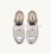 Medalist Super Vintage sneakers are the most authentic expression of Autry. This tennis-inspired design is comfortable and cozy, thanks to the high-quality materials used, while the 1980s vibe is enhanced by artisanal treatments that create a used, irregular, and unique look for each pair. These women's sneakers are made from silver-tone metalized leather with a lived-in appearance and details in green hues. The side insert draws attention to the distinctive Autry logo. The exclusive treatment used to create the vintage look is entirely Made in Italy. Notice the nylon tongue with an embroidered label and the signature heel tab in gray leather that add a touch of originality. SPECIFICATIONS: - Leather upper with a handcrafted used finish. - Micro-perforated toe. - Used-effect cotton laces. - Embroidery label detailing seamed at the tongue. - Padded collar. - Leather and cotton terry lining. - 2 cm-high raised sockliner in leather. - Outsole in rubber in the same color as the upper. - Height of sole: 2.5-3.5 cm. - Personalized shoe bag in fabric. COMPOSITIONS: Upper: 90% leather, 10% nylon Lining: 40% leather, 50% cotton terry, 10% nylon Sole: 100% rubber