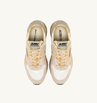 Innovative, light, and extremely flexible, Reelwind draws inspiration from the running world, enhanced by artisanal treatments that give each style a distinct, irregular, and unique used appearance. The women's style is crafted from a mix of white nylon and long hair suede, with side panels in gray crackle-effect leather. Designed for a dynamic lifestyle, it features a slender silhouette and performance construction that ensures maximum freedom of movement. The rubber sole with an embossed tread is personalized with a star pattern and an A-arrow that offers a graphic and modern reinterpretation of the logo. The exclusive treatment used to create the vintage look is entirely Made in Italy. SPECIFICATIONS: - Upper in crackle-effect leather, nylon and long hair suede. - Flat cotton laces. - Label detailing at tongue. - Padded collar. - Nylon, leather and cotton terry lining. - 2-cm raised sockliner in leather. - Running outsole in rubber sole with relief logo. - Height of sole: 2.5-3.5 cm. - Personalize shoe bag in fabric. COMPOSITION: Upper: 60% nylon, 40% leather Lining: 40% leather, 50% cotton terry, 10% nylon Sole: 60% Phylon, 40% rubber