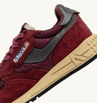 Reelwind low sneakers offer the technical edge of a performance sports shoe with the unmistakable style of the Autry aesthetic. This women's athletic shoe is crafted from burgundy nylon and is reinforced by inserts in color matching suede and gray leather that create a refined design. Light and streamlined, it is finished with a mesh toe and a running sole made of rubber and Phylon that absorbs impact on the road or field. Details on the tongue, outer side, and heel are personalized with the Autry logo, adding a touch of authenticity for a contemporary everyday aesthetic. SPECIFICATIONS: - Upper in leather, suede, nylon and mesh. - Mesh toe. - Flat laces in cotton. - Embroidery label detailing seamed at the tongue. - Padded collar. - Leather, terry and nylon lining. - 2 cm-high raised sockliner in leather. - Rubber sole. - Height of sole: 2.5-3.5 cm. - Personalized shoe bag in fabric. COMPOSITIONS: Upper: 20% leather, 25% suede, 40% nylon, 15% mesh Lining: 40% leather, 50% cotton terry, 10% nylon Sole: 60% Phylon, 40% rubber