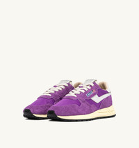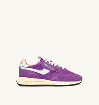 Reelwind sneakers blend Autry’s signature style with elements inspired by the world of running. Featuring a sleek silhouette and an ’80s-inspired retro design, they offer lightness, flexibility, and optimal grip. The women's style is crafted from a mix of purple nylon and suede, with side panels in white crackle-effect leather. Designed for a dynamic lifestyle, it features a performance-driven construction that ensures maximum freedom of movement. The rubber sole with an embossed tread is personalized with a star pattern and an A-arrow that offers a graphic and modern reinterpretation of the logo. SPECIFICATIONS: - Upper in leather, nylon and suede. - Flat cotton laces. - Label detailing at tongue. - Padded ankle collar. - Leather, nylon and cotton terry lining. - 2 cm-high raised sockliner in leather. - Running sole. - Height of sole: 2.5-3.5 cm. - Personalized shoe bag in fabric. COMPOSITION: Upper: 60% nylon, 40% leather Lining: 40% leather, 50% cotton terry, 10% nylon Sole: 60% Phylon, 40% rubber