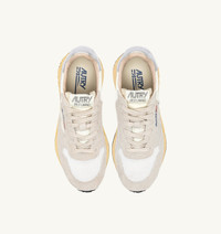 Innovative, light and extremely flexible, Reelwind Autry sneakers draw inspiration from the running world. The women's style is crafted from a mix of white suede and nylon, with side panels in silver-tone leather. Designed for a dynamic lifestyle, it features a slender silhouette and performance construction that ensures maximum freedom of movement. The rubber sole with an embossed tread is personalized with a star pattern and an A-arrow that offers a graphic and modern reinterpretation of the logo. SPECIFICATIONS: - Upper in nylon, suede, and mesh. - Mesh toe. - Flat cotton laces. - Label detailing at tongue. - Padded collar. - Nylon, leather and cotton terry lining. - 2-cm raised sockliner in leather. - Running outsole. - Height of sole: 2.5-3.5 cm. - Personalize shoe bag in fabric. COMPOSITIONS: Upper: 40% nylon, 20% metalized leather, 15% mesh,25% suede Lining: 30% leather, 50% cotton terry, 10% nylon Sole: 60% Phylon, 40% rubber