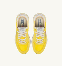 Innovative, light and extremely flexible, Reelwind Autry sneakers draw inspiration from the running world. The women's style is crafted from a mix of yellow nylon and suede, with side panels in white crackle-effect leather. Designed for a dynamic lifestyle, it features a slender silhouette and performance construction that ensures maximum freedom of movement. The Rubber sole with an embossed tread is personalized with a star pattern and an A-arrow that offers a graphic and modern reinterpretation of the logo. SPECIFICATIONS: - Upper in leather, nylon and suede. - Flat cotton laces. - Label sewn on tongue. - Padded collar. - Nylon, leather and cotton terry lining. - 2-cm raised sockliner in leather. - Running outsole. - Height of sole: 2.5-3.5 cm. - Personalize shoe bag in fabric. COMPOSITION: Upper: 60% nylon, 40% leather Lining: 40% leather, 50% cotton terry, 10% nylon Sole: 60% Phylon, 40% Rubber