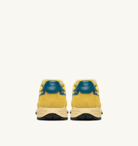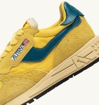Innovative, light and extremely flexible, Reelwind Autry sneakers draw inspiration from the running world. The women's style is crafted from a mix of yellow suede and nylon, with side panels in blue leather. Designed for a dynamic lifestyle, it features a slender silhouette and performance construction that ensures maximum freedom of movement. The rubber sole with an embossed tread is personalized with a star pattern and an A-arrow that offers a graphic and modern reinterpretation of the logo. SPECIFICATIONS: - Upper in nylon, suede, and mesh. - Mesh toe. - Flat cotton laces. - Label detailing at tongue. - Padded collar. - Nylon, leather and cotton terry lining. - 2-cm raised sockliner in leather. - Running outsole. - Height of sole: 2.5-3.5 cm. - Personalize shoe bag in fabric. COMPOSITION: Upper: 50% nylon, 40% leather, 10% mesh Lining: 40% leather, 50% cotton terry, 10% nylon Sole: 60% Phylon, 40% rubber