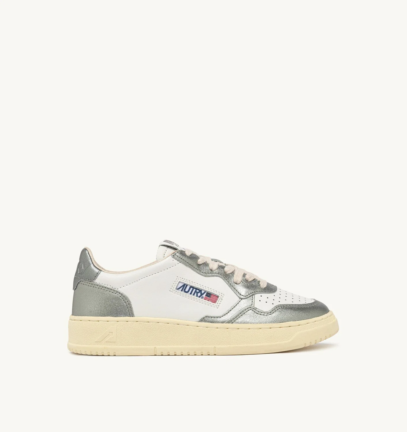 This edition of the Medalist sneakers comes in eye-catching colour combinations that will elevate your everyday look. This women's version channels the attitude of the original Autry design, inspired by 1980s tennis shoes, updating the proportions and materials to ensure excellent comfort and contemporary appeal. Fully crafted from leather, it features a bold colour block construction in white and gunmetal. SPECIFICATIONS: - Bicolor leather upper - Perforated toe - Flat cotton laces - Label sewn on tongue - Padded ankle collar - Lined in leather and cotton terry - 2 cm leather insole - Rubber sole with contrasting tread - Height of sole: 2,5-3,5 cm. - Fabric dust bag. COMPOSITION: Upper Material: 100% cow leather Lining: 40% pigskin; 50% towel; 10% nylon Outsole: 100% rubber