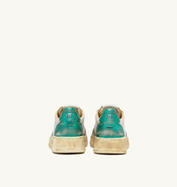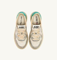 Medalist Super Vintage sneakers are the most authentic expression of Autry. This tennis-inspired design is comfortable and cozy, thanks to the high-quality materials used, while the 1980s vibe is enhanced by artisanal treatments that create a used, irregular, and unique look for each pair. These women's athletic shoes are made from soft leather with a lived-in appearance in white, metalized green and silver tones. The side insert draws attention to the distinctive Autry logo. The exclusive treatment used to create the vintage look is entirely Made in Italy. SPECIFICATIONS: - Leather upper with artisanal used treatment. - Micro-perforated toe. - Used-effect cotton laces. - Embroidery label detailing seamed at the tongue. - Padded collar. - Leather and cotton terry lining. - 2-cm raised sockliner in leather. - Rubber sole. - Height of sole: 2.5-3.5 cm. - Personalize shoe bag in fabric. COMPOSITION: Upper: 100% leather Lining: 40% leather; 50% cotton terry; 10% nylon Sole: 100% rubber