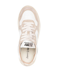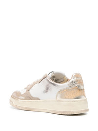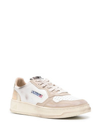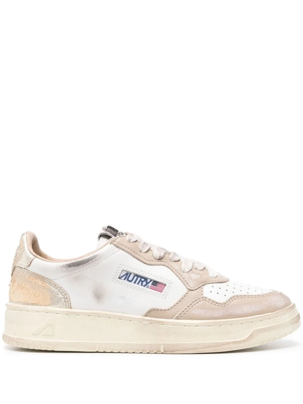 Medalist Low Super Vintage sneakers Autry's Medalist Low sneakers are a re-release of an original '80s design. This white and beige Super Vintage pair takes its name from the distressed finish, which is achieved at the hands of master craftsmen using innovative techniques. They’re made from panels of leather and suede with gold foiling at the heel and signature American flag logos that honour the brand’s roots. Highlights - White, beige, gold-tone - Calf leather - Calf suede - Panelled design - Distressed finish - Padded ankle - Contrasting branded heel counter - Logo at the sole - Logo patch to the side - Logo patch at the tongue - Perforated toebox - Round toe - French terry lining - Flat rubber sole - Front lace-up fastening - This piece comes complete with a protective dust bag. Imported Composition Lining: Fabric 100%, Calf Leather 100% Outer: Calf Leather 100% Sole: Rubber 100% SIZE & FIT Measurement HEEL 1.37 in(3.5 cm) Sole height 0.78 in(2 cm)