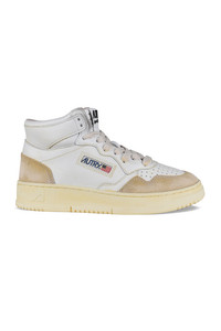 Super vintage Autry high-top sneakers in white leather and suede. Yellowed effect. Logo patch on outer side. White leather counter with embossed logo. Tongue with logo patch. Vintage-effect rubber sole. Lace-up closure. Perforated round toe. 100% leather.