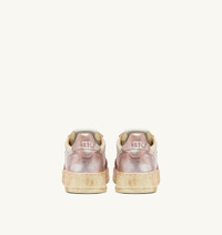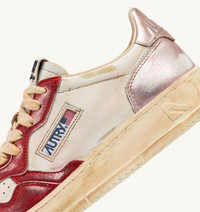 Medalist Super Vintage sneakers are the most authentic expression of Autry. This tennis-inspired design is comfortable and cozy, thanks to the high-quality materials used, while the 1980s vibe is enhanced by artisanal treatments that create a used, irregular, and unique look for each pair. These women's athletic shoes are made from soft leather with a lived-in appearance in white, metalized pink and red tones. The side insert draws attention to the distinctive Autry logo. The exclusive treatment used to create the vintage look is entirely Made in Italy. SPECIFICATIONS: - Leather upper with artisanal used treatment. - Micro-perforated toe. - Used-effect cotton laces. - Embroidery label detailing seamed at the tongue. - Padded collar. - Leather and cotton terry lining. - 2-cm raised sockliner in leather. - Rubber sole. - Height of sole: 2.5-3.5 cm. - Personalize shoe bag in fabric. COMPOSITION: Upper: 100% leather Lining: 40% leather; 50% cotton terry; 10% nylon Sole: 100% rubber