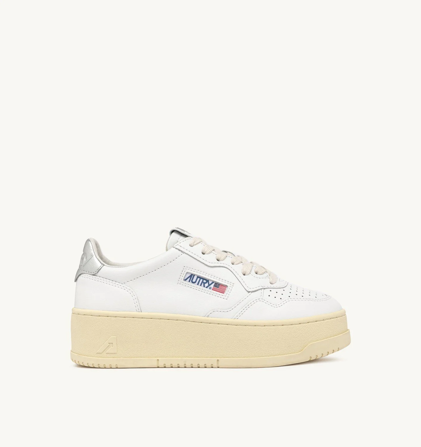 A new interpretation of the authentic Autry Medalist, elevated by a platform sole that adds extra flair to the look. A perfect blend of 1980s tennis inspiration and contemporary attitude, this sneakers stands out with unexpected volume and the signature logo detail on the heel. This women’s sneakers features all the hallmark details of the style: a soft white leather upper with a silver-tone metalized leather logo heel tab, micro-perforations on the toe for added breathability, and the iconic Autry logo on the side. The chunky rubber sole elongates the silhouette and confidently supports movements. SPECIFICATIONS: - Upper in leather. - Micro-perforated toe. - Flat laces in cotton. - Embroidery label detailing seamed at the tongue. - Padded collar. - Leather and cotton terry lining. - 2 cm-high raised sockliner in leather. - Platform sole in rubber. - Height of sole: 4 cm. - Personalized shoe bag in fabric. SPECIFICATIONS: Upper: 100% leather Lining: 40% leather, 50% cotton terry, 10% nylon Sole: 100% rubber