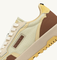 The new Autry Wildpace style stands out for its outdoor-inspired design, featuring technical details that enhance performance. Crafted from beige ripstop nylon and brown leather, this sneakers is enhanced with TPU-coated details, a side insert with the Autry logo in silicone, and a suede heel tab with an embossed logo. The sole is characterized by the lightweight Phylon and a contrast color tread that provides high-performance grip. The comfortable removable sockliner is made in collaboration with "Ortholite". SPECIFICATIONS: - Upper in leather and ripstop nylon. - Micro-perforated toe. - Flat cotton laces and two-tone hiking-inspired laces. - Logo print on the tongue. - Padded collar. - Nylon and cotton terry lining. - 1 cm-high raised Ortholite sockliner. - Sole in rubber and Phylon. - Height of sole: 3.5-4.5 cm. - Personalized shoe bag in fabric. SPECIFICATIONS: Upper: 45% ripstop nylon, 30% leather, 5% suede, 20% welded TPU Lining: 30% mesh, 10% leather, 50% cotton terry, 10% nylon Sole: 100% rubber and phylon