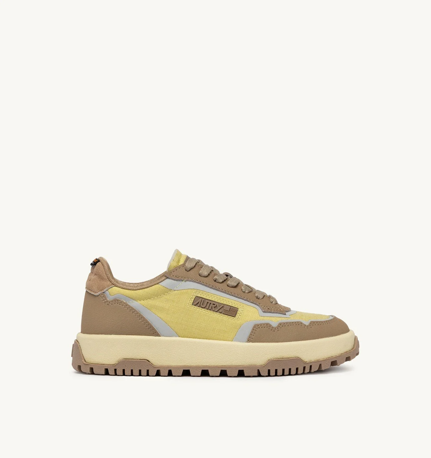 The new Autry Wildpace style stands out for its outdoor-inspired design, featuring technical details that enhance performance. Crafted from yellow ripstop nylon and beige leather, this sneakers is enhanced with TPU-coated details, a side insert with the Autry logo in silicone, and a suede heel tab with an embossed logo. The sole is characterized by the lightweight Phylon and a contrast color tread that provides high-performance grip. The comfortable removable sockliner is made in collaboration with "Ortholite". SPECIFICATIONS: - Upper in leather and ripstop nylon. - Micro-perforated toe. - Flat cotton laces and two-tone hiking-inspired laces. - Logo print on the tongue. - Padded collar. - Nylon and cotton terry lining. - 1 cm-high raised Ortholite sockliner. - Sole in rubber and Phylon. - Height of sole: 3.5-4.5 cm. - Personalized shoe bag in fabric. SPECIFICATIONS: Upper: 45% ripstop nylon, 30% leather, 5% suede, 20% welded TPU Lining: 30% mesh, 10% leather, 50% cotton terry, 10% nylon Sole: 100% rubber and phylon