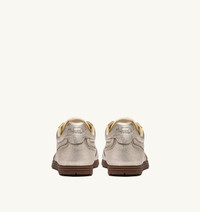 Autry Windspin is the brand’s new icon, blending the spirit of the American dream with a touch of Italian flair. Inspired by 1960s American lifestyle, the Windspin pays tribute to an era defined by freedom and adventure. Crafted from platinum-color laminated leather with tone-on-tone inserts, the Windspin features a sleek, streamlined silhouette. Its flat, dynamic profile embodies Autry’s signature fusion of vintage charm and modernity. The ultra-flat rubber sole ensures excellent grip on all urban surfaces. SPECIFICATIONS: - Upper in leather. - Perforated toe. - Flat laces in cotton. - Lightly padded tongue in nylon with jacquard logo label - Padded collar. - Leather and cotton terry lining. - 0.8 mm high raised mesh-lined sockliner. - Rubber sole. - Height of sole: 1 - 1.7 cm. - Personalized shoe bag in fabric. COMPOSITIONS: Upper: 90% leather, 10% nylon Lining: 40% leather, 50% cotton terry, 10% nylon Sole: 100% rubber