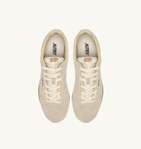 Autry Windspin is the brand’s new icon, blending the spirit of the American dream with a refined Italian touch. Inspired by the carefree lifestyle of 1960s America, Windspin pays tribute to a time defined by freedom and adventure. Crafted in dark ivory white brushed suede with tone-on-tone leather side inserts, the Windspin features a sleek, streamlined silhouette. Its flat, dynamic profile embodies Autry’s signature fusion of vintage charm and modernity. The ultra-flat rubber sole ensures excellent grip on all urban surfaces. SPECIFICATIONS: - Upper in suede and leather. - Flat laces in cotton. - Lightly padded tongue in nylon with jacquard logo label - Padded collar. - Leather and cotton terry lining. - 0.8 mm high raised mesh-lined sockliner. - Rubber sole. - Height of sole: 1 - 1.7 cm. - Personalized shoe bag in fabric. COMPOSITIONS: Upper: 70% suede, 10% nylon, 20% leather Lining: 40% leather, 50% cotton terry, 10% nylon Sole: 100% rubber