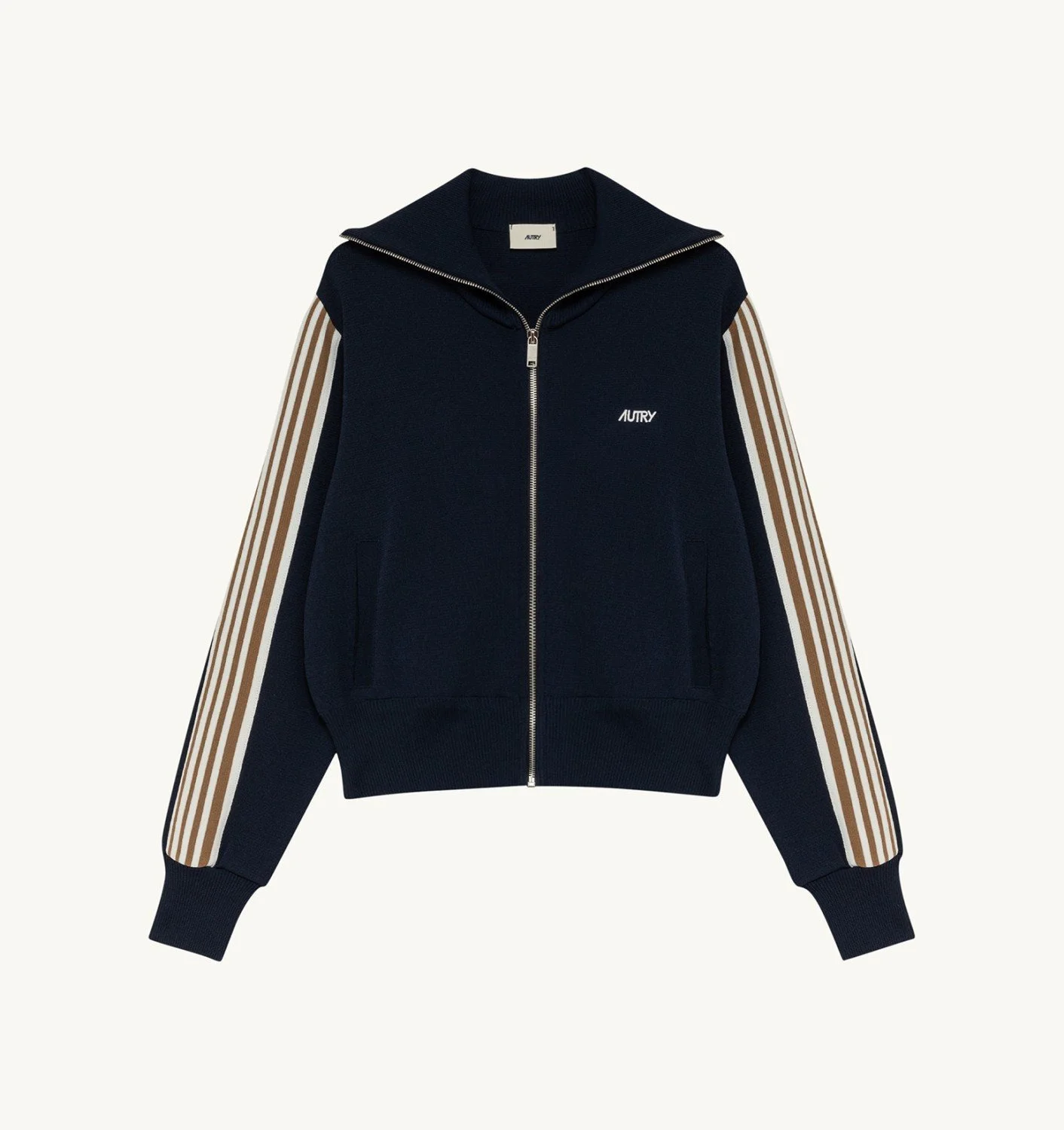 DETAILS: - 65% viscose 35% polyamide - Metal zip with logo puller - Side striped band in contrast - Autry embroidery logo at chest - Regular fit The model is 1.75 m tall and wears size M.