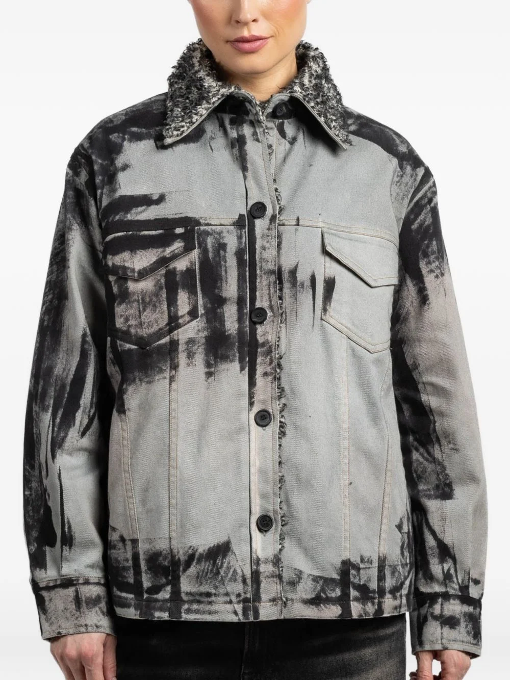 abstract pattern collar jacket Highlights - Grey and black - Abstract pattern - Button fastening - Chest pockets - Point collar - Long sleeves Imported Composition Fabric 100% Washing instructions Read Manufacturer Guidelines