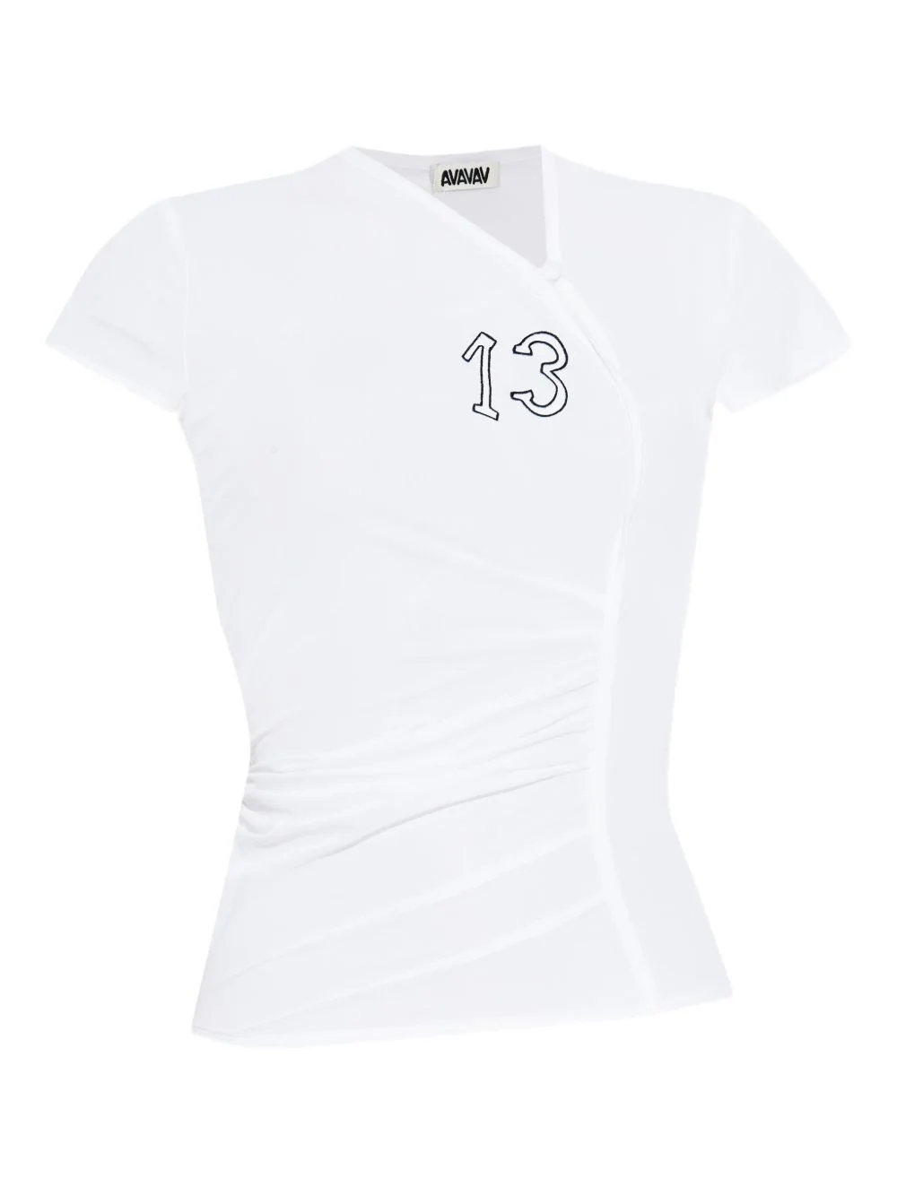 number-embroidered T-shirt Highlights - White - Front button fastening - Semi-sheer construction - Short sleeves - Straight hem Imported Composition Nylon 90%, Elastane 10% Washing instructions Read Manufacturer Guidelines