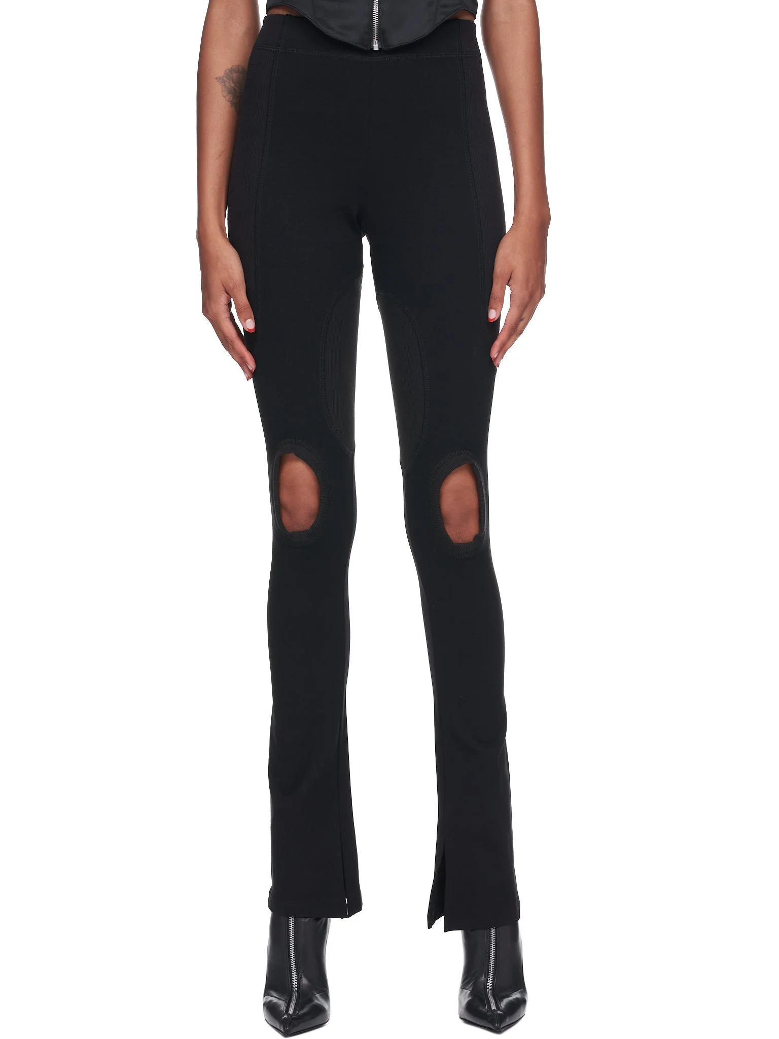 AVAVAV leggings in black, dual fabric construction, knee cut out detail, inner hem slit, form fit. Made in Italy Standard Sizing Composition: 75% Polyester, 25% Elastane Model is 6'0" and is wearing size XS. Bust: 33" Waist: 24" Hip: 34.5"