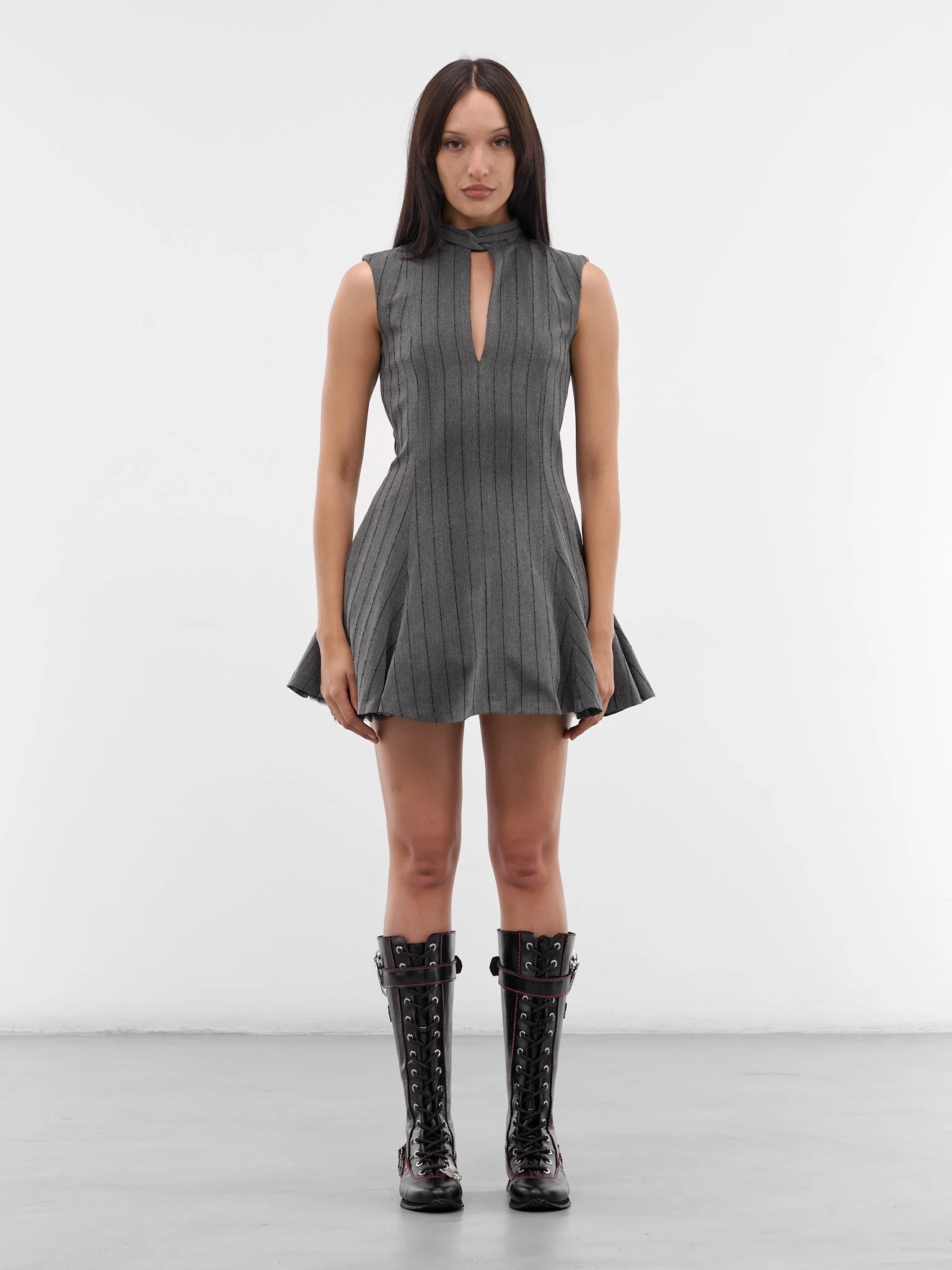 A gray poly-viscose mini dress with twisting at the collar and an exposed tulle-lined skirt. Featuring: • Slim fit • Poly-viscose blend construction • Pinstripe pattern • Stand collar with twist and back self-tie fastening • Front cut-out • Sleeveless with armholes • Flared and ruffled skirt • Exposed tulle lining • Mini length • Made in Lithuania • Outer: 78% Polyester 19% Viscose 3% Elastane | Lining: 100% Polyester • Standard sizing Model is 5'8" wearing size S. Bust: 32" Waist: 26" Hips: 34.5"