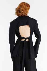 This 3-in-1 wool-blend jacket combines a shirt, waistcoat and blazer in one versatile piece. It features notched lapels, a point collar and tortoise-shell buttons. The single-breasted front is enhanced with long sleeves, button cuffs, chest and hip flap pockets. The back cut-out with an adjustable tie-up detail adds a cinched finish, creating a flattering silhouette. Shown here with Trousers With Vertical Knee Slits Black. FIT & SIZE - Designed with a relaxed fit. - True to size, we recommend choosing your regular size. - Model is 177 cm / 5'9" (bust: 73 cm / 28½”, waist: 60 cm / 23½”, hips: 84 cm / 33”) and is wearing a size FR 36. PRODUCT DETAILS - 98% Wool 2% Elastane; Lining: 100% Viscose - Midweight material. - Lined. - One piece that cannot be separated. - Button-front. - Dry clean. - Made in Lithuania.