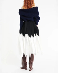 The A-Line Skirt with Panel by A.W.A.K.E. Mode is a striking skirt featuring raw-edged 3D panels colorblocked in contrasting colors and fabrications. - Fabric 1: 100% Polyester - Fabric 2: 96% Cotton 4% Elastane - Dry Clean - Zip fly - Made in Lithuania - #PSS26.S03.PLC01