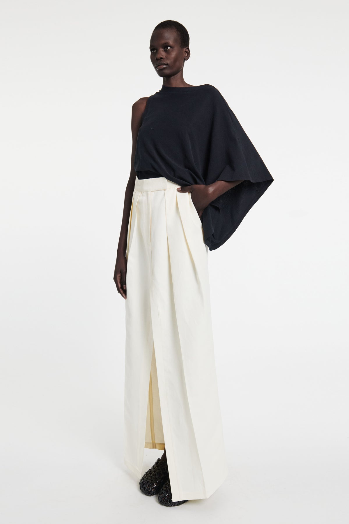 This GOTS-certified jersey T-shirt features our signature asymmetric one-sleeve design with a batwing style sleeve on one side, a voluminous loose fit around a chest and a slim waistline. Shown here with Weaved Clogs Black. Also available in white. FIT & SIZE Designed with a relaxed fit at the bust and a slim fit at the waist. True to size, we recommend choosing your regular size. Model is 180 cm (5’11’’) and is wearing a size S. PRODUCT DETAILS 100% Organic Cotton Hand wash or dry clean. Made in Portugal.